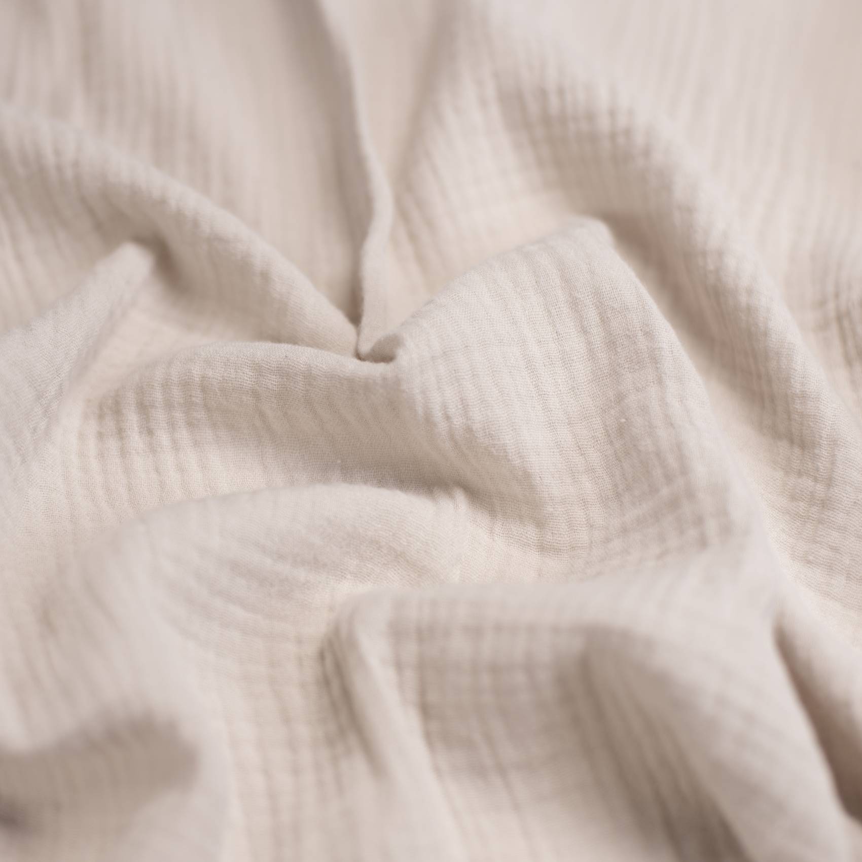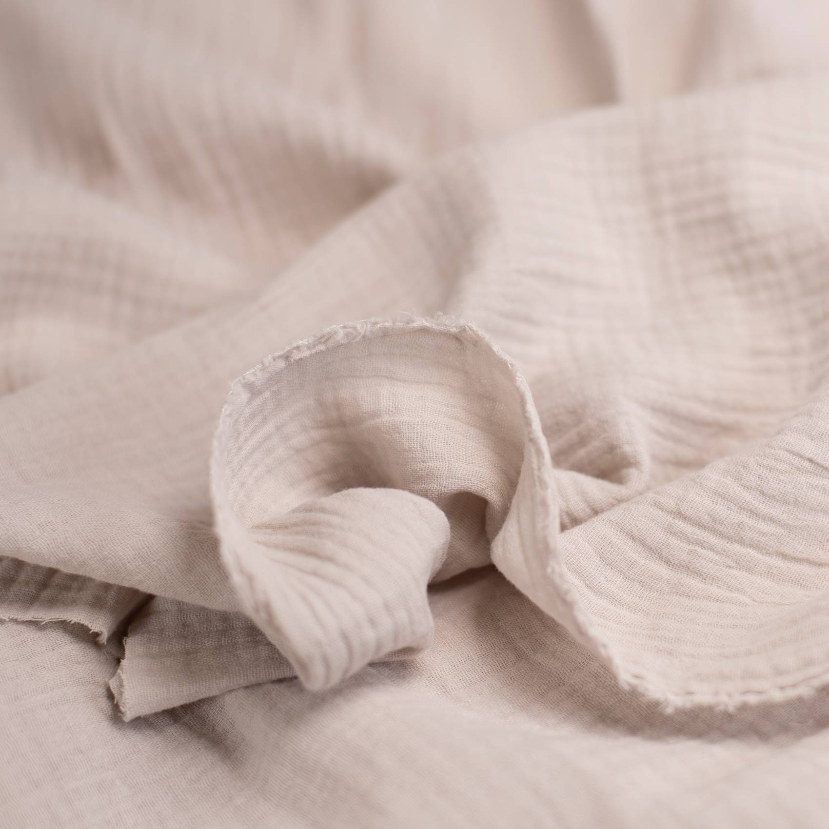 Muślin bawełniany Double Gauze składa się z dwóch cienkich warstw, przez co skutecznie otula, lecz nie prześwituje. Rodzaj splotu nadaje tkaninie charakterystycznego, nieco pomarszczonego wyglądu. Tkanina jest miękka i lekka, a jednocześnie niezwykle wytrzymała. Dobrze utrzymuje strukturę.